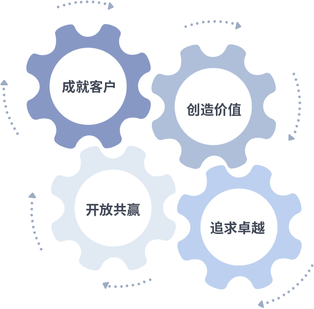 成就客户是一切决策的出发点,,,,创造价值是衡量所有工作的标准,,,追求卓越是我们做事做人的态度,,,开放共赢是我们的格局也是最终的结果。。。价值观的齿轮环环相扣,,推动着组织里的每个人不断向前。。。